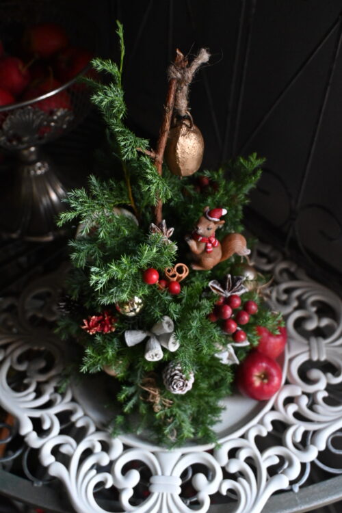 実物やボールなどオーナメントの飾りを付けて仕上げていきますよ