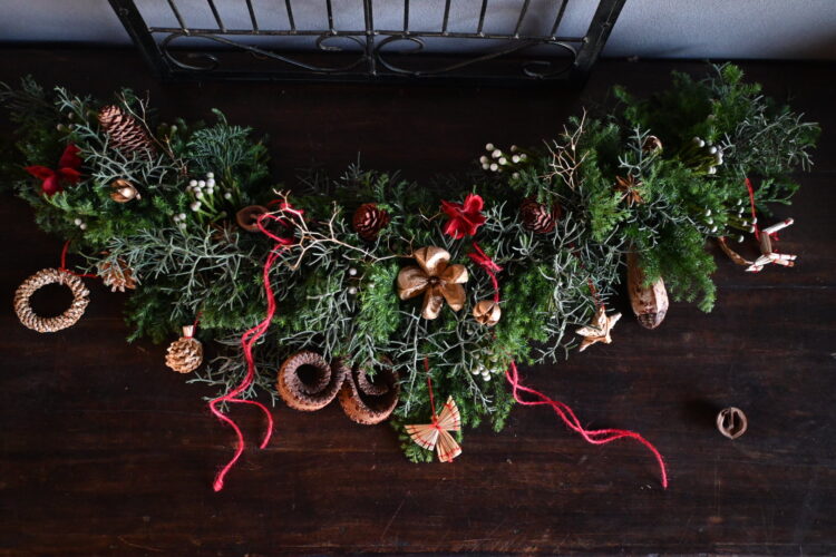 実物や可愛らしいオーナメントで飾り付けをした温かみのあるガーランドとなっています