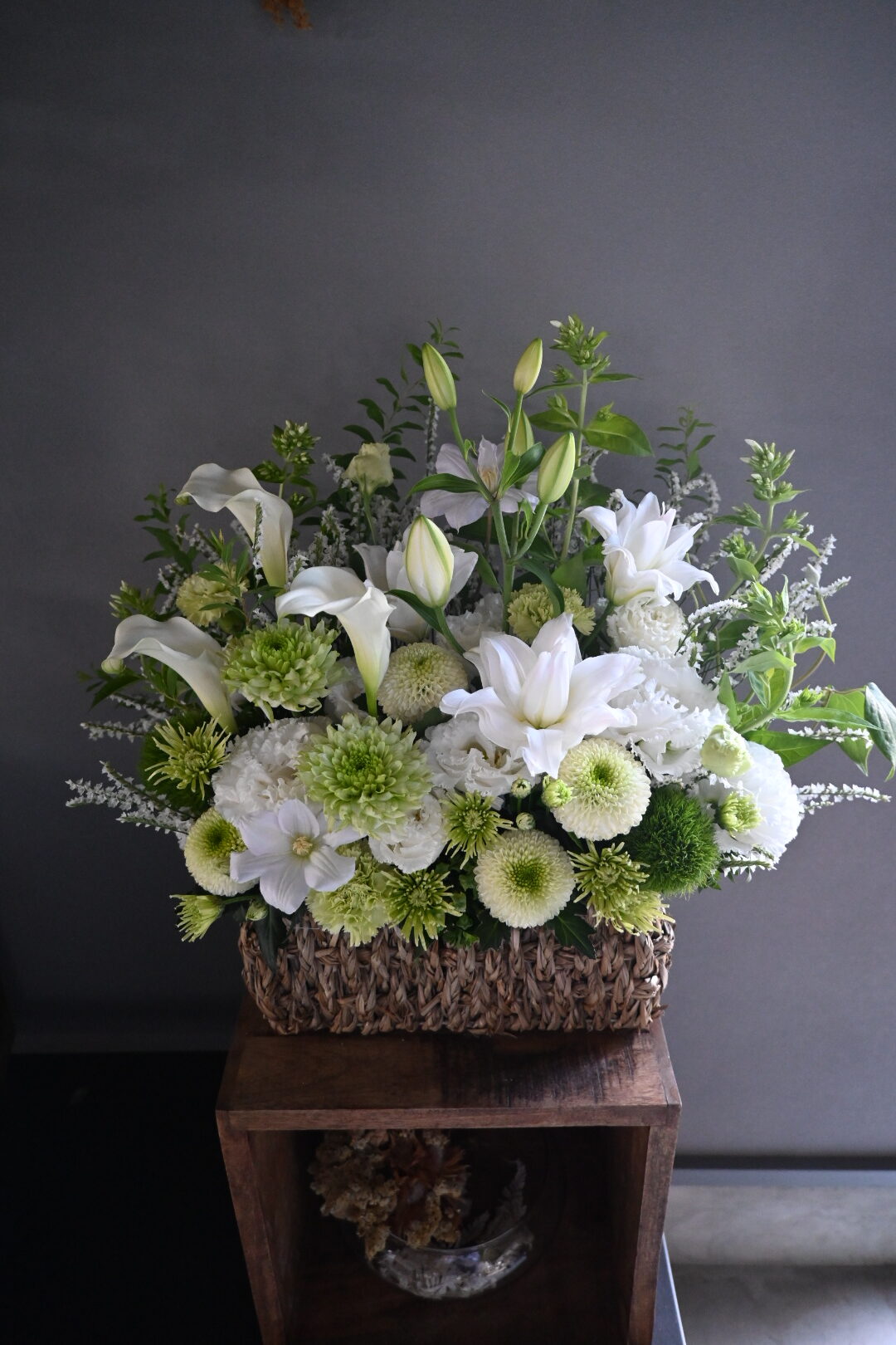 ¥8800白を基調としたお花を中心に、お悔み・お供えのご用途にご利用いただけるアレンジメントです。