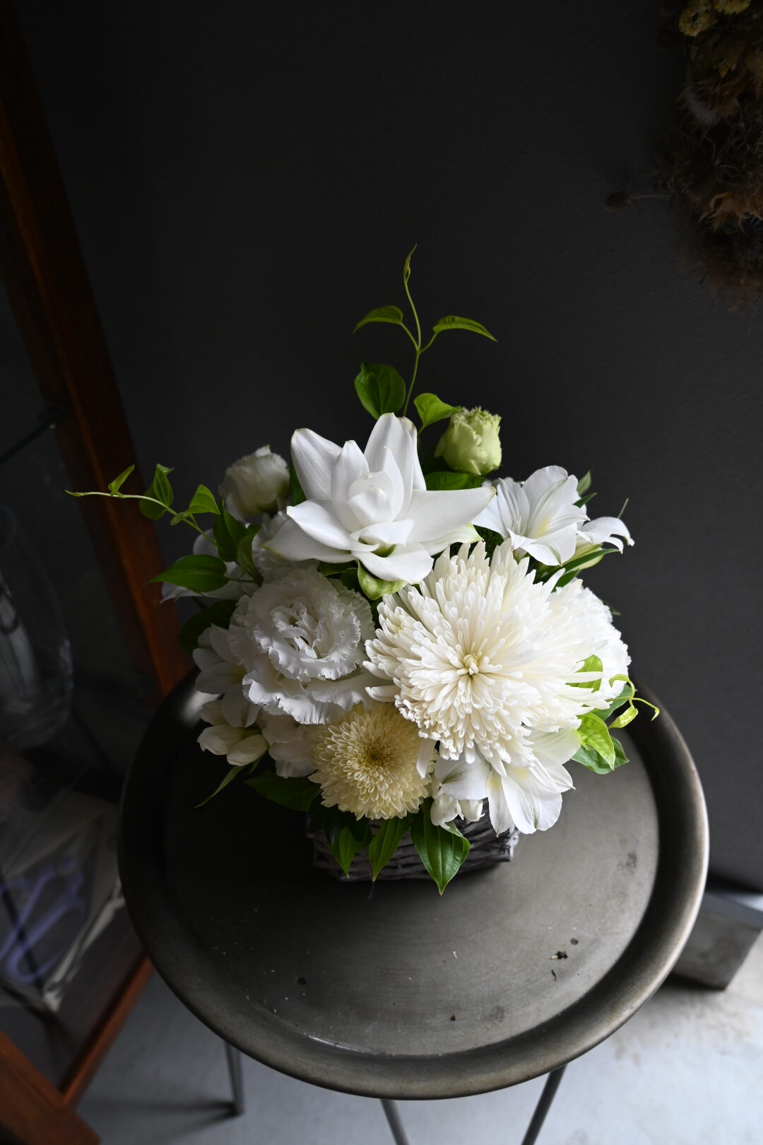 ¥3300白を基調としたお花を中心に、お悔み・お供えのご用途にご利用いただけるアレンジメントです。