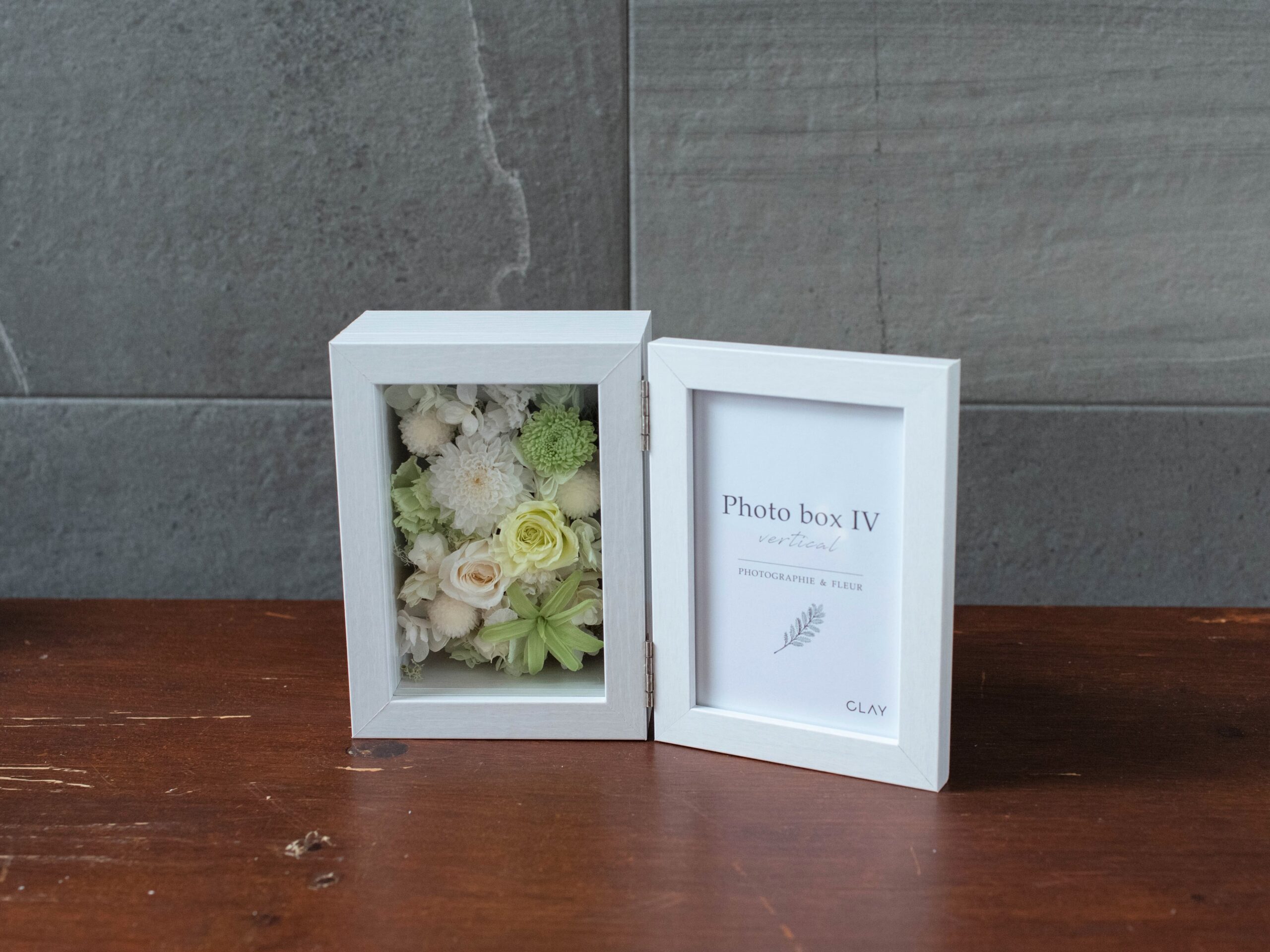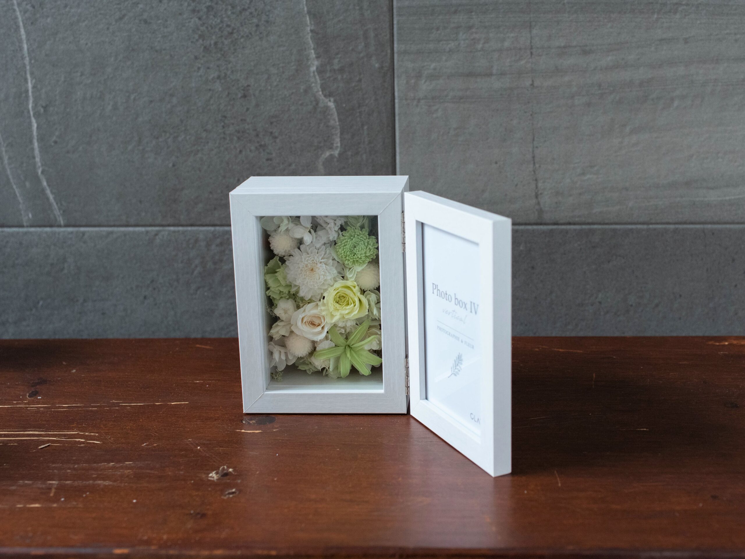 シンプルな白いフォトフレームの中に、グリーンと白を基調としたお花を敷き詰め、癒され心安らぐ仕上がりに。